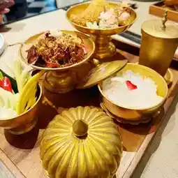 Tucked inside the serene setting of Jim Thompson Restaurant, this seasonal Thai dish — khao chae — was the absolute highlight. Served in elegant brassware, the chilled jasmine rice in floral-scented water came with a stunning selection of traditional side dishes: sweet shredded pork, stuffed chili, crispy fried shallots, and more. Every bite was delicate, refreshing, and beautifully balanced.