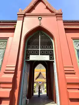 Located on the north side of the temple, the crimson museum building is a restored Rama V-era artifact storage. The contrast between the Gothic-style iron lattice windows and red plaster is striking, with the best color around 9 a.m.