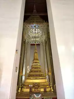 Inside the main hall is a small seven-tiered golden stupa with a canopy of mirror mosaics. Photography is allowed inside, but flash is prohibited. Please remove shoes and hats before entering.