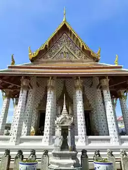 Built during the reign of Rama II, unified in white inside and out with gold decorations. Pay attention to the wooden carved Garuda above the door.