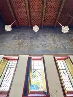 📍 The high windows and chandeliers reflect natural light on the gold leaf lattice, bathing the entire interior in a soft golden hue.