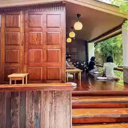 • Wood-tone and earth-tone cafe giving a warm, shady, and private feeling