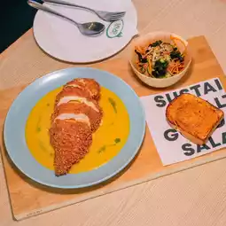 🍽️ Grilled Chicken Breast Steak with Japanese Black and White Mushroom Sauce: Boost your protein intake with juicy grilled chicken breast steak marinated with over 20 spices. Served with a rich Japanese mushroom demi-glace sauce, accompanied by a colorful side dish of grilled vegetables including broccoli, carrot, baby corn, tomato, asparagus, and pumpkin & corn puree.