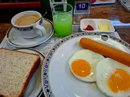 ✨️The menu is very extensive. I saw people ordering the breakfast set, so I tried it too. The food looks good. You can choose fried egg or omelet, sausage, bacon or ham, white bread or whole wheat, orange juice or guava juice, plus hot coffee. The price is only 84 baht.