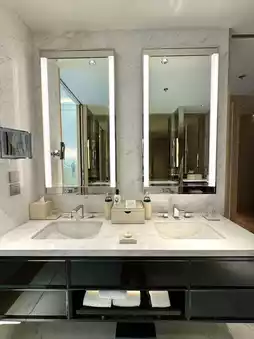 📍 The marble double sink is equipped with amenities from British brand ASPREY. The central storage box neatly organizes toothbrushes and razors, keeping the counter beautifully tidy.