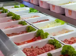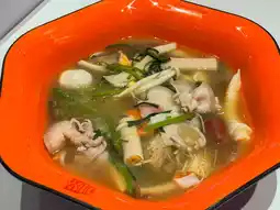 The food is DIY-style, allowing you to choose your own ingredients based on your preferences. Ingredients include vegetables, meatballs, noodles, meats, mushrooms, and seaweed.