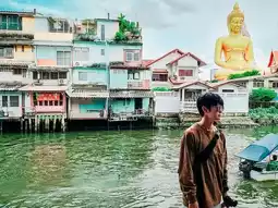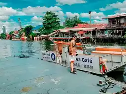 Uruea Cafe, Soi Phetkasem 15, highlights include a view of the large Buddha statue from Wat Paknam Phasi Charoen. The atmosphere is nice with a good view, next to a canal with boats passing by. It is a photo spot for the large Buddha statue of Wat Paknam Phasi Charoen. There are two seating zones: indoor air-conditioned rooms and outdoor open-air seating. Food and drinks are available.