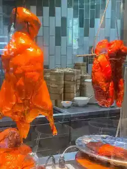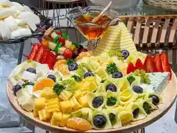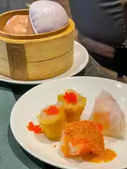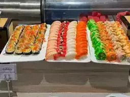 The food line includes sushi, sashimi, dim sum, fish maw soup, roasted duck, red pork or crispy pork, vegetable salad, cold cuts and cheese, pizza, fruits, bakery items, shaved ice, Thai desserts, coconut pancakes, fried bananas, and ice cream.