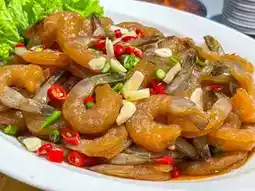 There are live cooking stations preparing fresh dishes one by one, such as fried rice, stir-fried basil, papaya salad, spicy salad, grilled items, pasta, stuffed omelet, pork knuckle, and noodles.