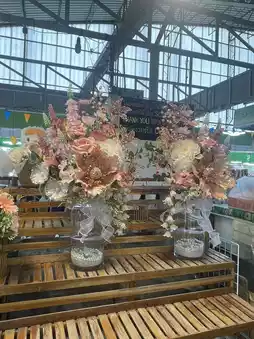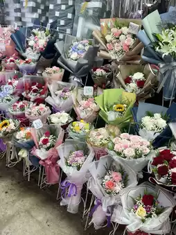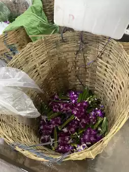Many flowers in Thailand are imported from Yunnan, and the variety is not as diverse as in Taiwan, with a lot of repetition. The bamboo baskets are filled with local Dendrobium orchids, some yellow flowers I don’t know, and freshly picked lotuses (pink/white) that surprisingly last all day with the folds still looking beautiful—so amazing!