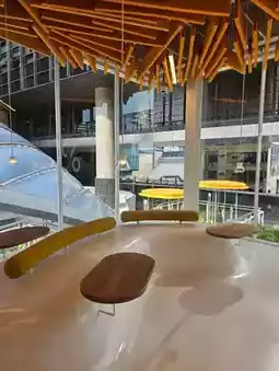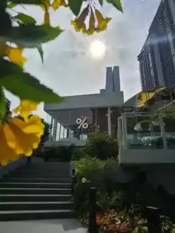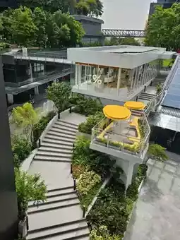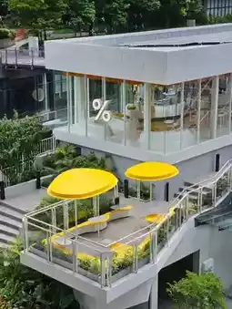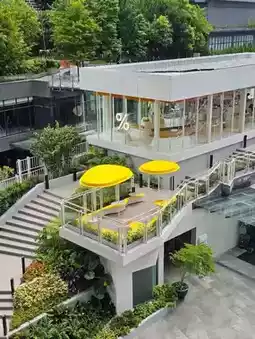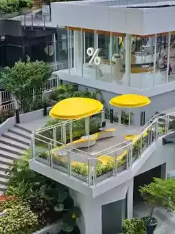 The shop is very beautiful, located prominently at the front area. There are both indoor and outdoor seating zones. The shop is decorated in a clean white and yellow tone.