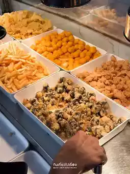 The self-service section is the fried food zone, with French fries, chicken pops, nuggets, all freshly fried. They keep refilling the food. Sprinkling cheese powder is heavenly. Including drinks, the price per person is less than 300 baht. You can eat until you're full without having to get up and leave yourself.