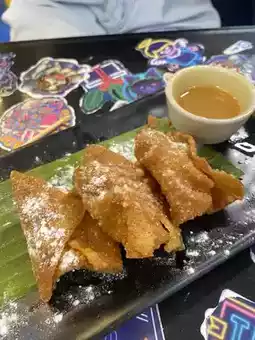 We tried the main dish, crispy banana dumplings topped with caramel sauce. It has a crispy outside and soft inside texture, with a distinct sweet banana flavor that pairs perfectly with the rich, sweet caramel sauce. So delicious, it’s worth sharing.