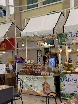 The atmosphere inside is decorated in a contemporary Thai style, giving a royal palace vibe, especially in the market zone where there are plenty of Thai foods, including Thai desserts, herbal drinks, single-dish meals, and even handicraft souvenirs like Thai fabrics and vintage-style keychains.