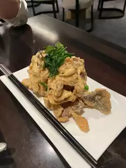 • Crispy prawns with wasabi salad dressing: crispy fried prawns tossed in wasabi cream salad, sweet and spicy balanced, considered a signature dish