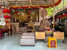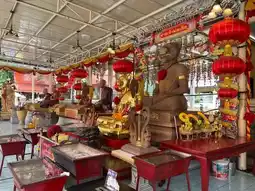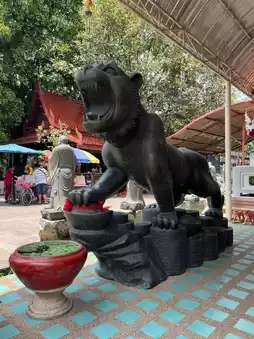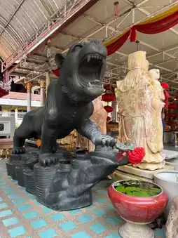 The Tiger God Shrine at Wat Krathum Suea Pla is another sacred spot popular among devotees for blessings, especially for luck and stability in life. The shrine is decorated in a Chinese style, featuring a prominent tiger image that gives a powerful and respectful feeling. Inside, it is orderly and quiet, suitable for chanting and making wishes. People often come to make offerings with simple items such as red drinks, fruit, incense, and candles.