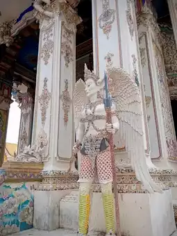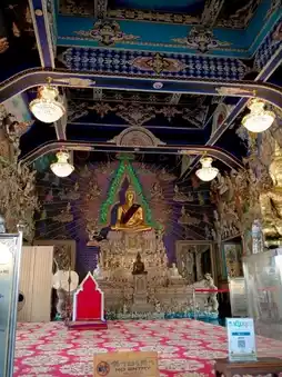 Pariwat Ratchasongkhram Temple, or Pariwat Temple, is a beautiful temple by the Chao Phraya River in the Rama 3 area. There is a pavilion for worship and making merit, offering Sangkhatan. Walking inside by the river, there is a statue of Lord Ganesha for worship. The highlight here is the ordination hall decorated with Benjarong stucco, showcasing contemporary art. Inside, there is Luang Pho Sukhothai as the principal Buddha image in the hall.