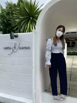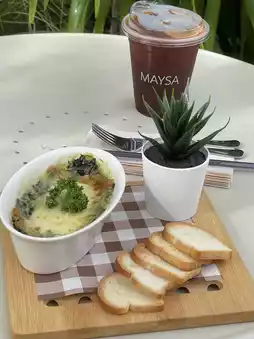 This place is called Maysa BKK, a very warm café decorated in a cute and homely style, giving the feeling of being in a cozy home. There is a front garden to sit and relax, and also an indoor area to unwind. The space inside the café is quite large, with many beautiful photo spots. The café offers food, desserts, and drinks. We ordered the baked spinach with cheese and were very impressed—it was delicious.