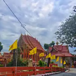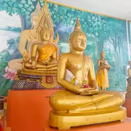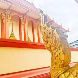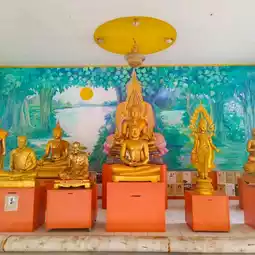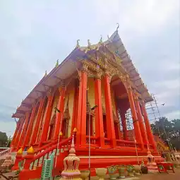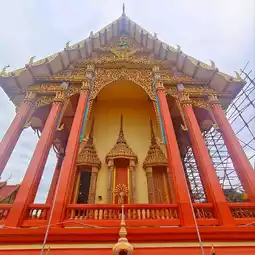 - The ordination hall (Ubosot) is 14 meters wide and 40 meters long, built in 1976. It has a triple-tiered tiled roof with chofah (decorative finials), bai raka (serpent-like roof decorations), and crown-shaped doors and windows. The decorations imitate Ayutthaya art style. The pillars have chamfered corners, and there is a walkway around the ordination hall and the surrounding cloister wall.