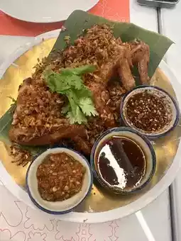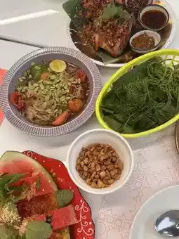 Signature Dish: Watermelon Salad - A perfect pairing of juicy, sweet watermelon with a zesty Isaan-style dressing. Available in two versions: fermented fish sauce or regular fish sauce, mixed with fresh chili, lime, and shallots. The result is a sweet, cool, spicy, and tangy flavor with a refreshing twist from passion fruit, making it an extraordinary dish you'll want to revisit.