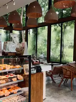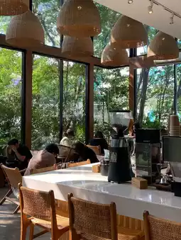 A healing café with a natural feel and a very lush atmosphere surrounded by trees. The decoration is simple but very stylish. Most importantly, their drinks and desserts are delicious, and the coffee is organic from the shop itself. This place is called MiVana Coffee Flagship Store or Mivana Coffee.