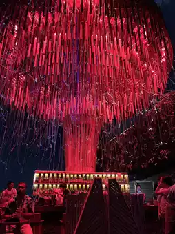 The highlight of Tichuca is its giant LED-lit “tree” installation at the center of the rooftop, which glows beautifully at night and creates a magical, tropical ambiance. Surrounded by greenery, wooden furniture, and a laid-back vibe, it feels like a forest oasis in the sky.