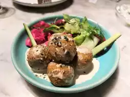 A fried dish originating from the Middle East made from ground chickpeas shaped into round balls like meatballs. It’s very well seasoned so you forget there’s no meat. Served hot, crispy outside and soft inside, slightly salty with a fragrant spice aroma. Served with salad and pickles to balance the flavors. You can eat it plain or with pita bread.