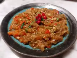 A dip made from eggplant and bell peppers blended with garlic, parsley, and olive oil. It tastes fully of eggplant with a fragrant bell pepper aroma but not spicy.