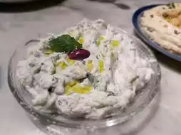 The base of this dip is Greek yogurt (strained yogurt), creamy but not heavy, with a slight tang. Mixed with cucumber, mint leaves, coriander, garlic, and lemon, it tastes refreshing and is great for balancing heavier dishes.
