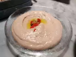 Chickpeas boiled until soft, mixed with tahini (sesame sauce) and coarsely mashed, seasoned with lemon, garlic, and olive oil, topped with whole chickpeas for a fun texture. Very enjoyable to eat.