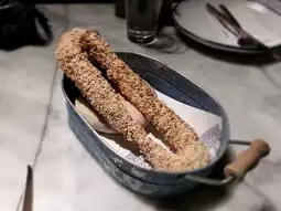 Freshly baked bread daily, with two types: warm pita bread and koulouri or sesame bagel. The pita bread is slightly dry but fun to chew, while the sesame bagel is even better—dense, chewy, fragrant with sesame, and crispy on the outside. Dip it in any dip and it’s pure bliss.