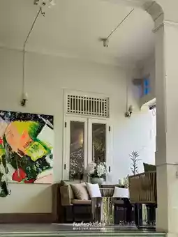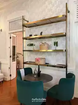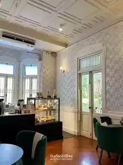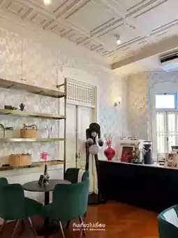 Ban Dahla, a café hidden inside a large house in the heart of the city, sharing space with the restaurant Ban Dahla by Angkana. The café area is at the front, so you can simply open the door and find it right there. There are small seats to relax, and a counter to order drinks. Delicious Thai desserts are beautifully displayed in the cabinet.