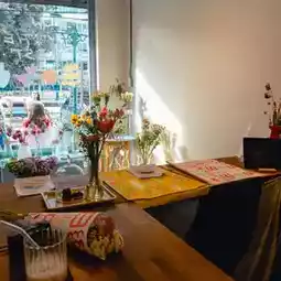 A cozy little café in the heart of the city filled with the scent of fresh flowers and warmth