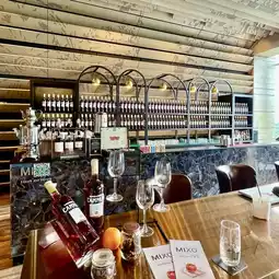 The modern interior and cozy lighting create a sophisticated ambiance, perfect for chatting with friends or a date.
