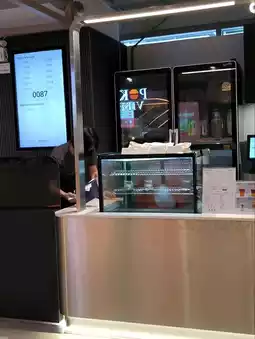 The flavor is a mildly sweet chocolate with bits of orange pulp that you can chew. Inside the shop, there is a counter where you order and then move on, but there are also seats on the left side for people to wait.