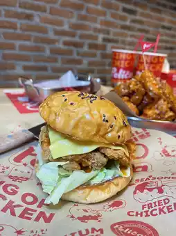 Crispy chicken burger (149.-) Large burger with a big piece of fried chicken, crispy and tasty.