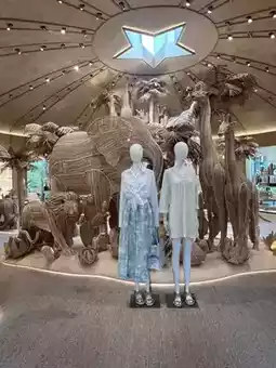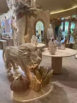 Inside is the merchandise area, and further in is the café. The décor mainly features apricot and white colors, with decorations created using bamboo weaving. It is truly atmospheric, exquisite, and very beautiful.