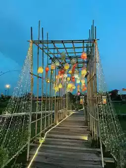 ✨ There are many cozy spots to sit, whether in the cool air-conditioned room or the outdoor area under big trees. The most popular spot is the bamboo bridge stretching across a small rice field, a photo corner everyone must stop by.