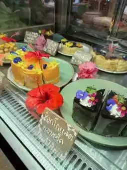 ✨ Recommended drinks include coconut coffee, fragrant and smooth with a little sweetness, or if you like iced tea, the Thai tea is rich and flavorful. For desserts, there are cakes, pastries, and Thai-style sweets served cutely.