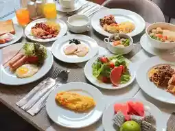 🥘 The Market restaurant offers all-day dining. At lunchtime, there is an International Buffet priced at 550 THB, with a special promotion at 385 THB. The menu includes Thai dishes, fried mussels, sukiyaki, sashimi, salads, fruits, and desserts, all you can eat. 🥐 Breakfast is also a full buffet with a variety of dishes to choose from, or you can order hot pizza to enjoy while watching the sunset from your room.