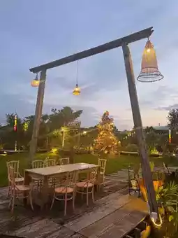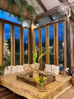✨ A Lanna-style café decorated with wooden materials and bamboo arches, creating a warm atmosphere like chilling in the North.