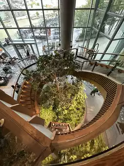 • A spiral staircase with a coffee tree sculpture