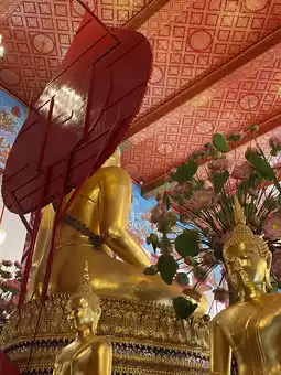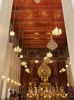 Besides the Buddha statues, the ubosot also contains other interesting features, such as mural paintings depicting the life of the Buddha on the surrounding walls. Although these murals are newly painted and not ancient works hundreds of years old, they have a unique charm. Especially notable is the depiction of angels displaying their powers using only line drawings. At first glance, one might think the artist didn’t finish the work, but it was intentional to show that these angels are manifesting their powers without revealing their forms, so ordinary people cannot see them.