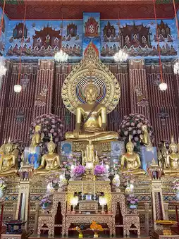 Inside, you will find a large principal Buddha image in the Mara Vichai posture, standing prominently as the main figure of the building, surrounded by 15 smaller Buddha statues, making a total of 16 statues. This principal Buddha is named Phra Phuttha Norasi Trilok Chet Mahathisak Puchaniyachayanta Kodom Borom Sasda Anawarayana, or popularly called "Luang Pho Pu" by locals.