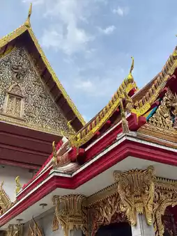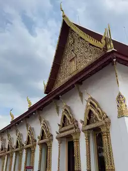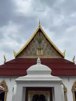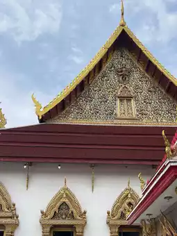 Another thing to notice is the pediment frame. In most temples, the frame has a "naga sudung" (serpent motif) that makes the frame curved. But here, it only has a "ruay raka" (decorative pattern) and omits the naga sudung, resulting in a straight frame similar to a typical house gable. This is a distinctive feature of the architectural style of the Front Palace craftsmen, found in temples or palaces built by the nobility of the Front Palace faction. This contrasts with the Royal Palace craftsmen’s architecture, which always includes the naga sudung.