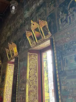 Besides the principal Buddha, the interior walls of the ordination hall are decorated with Chinese auspicious symbols murals, a style that first appeared during this reign. Previously, murals would depict the Ten Jataka tales, Buddhist history, or cosmology. The use of Chinese auspicious symbols likely comes from the Chinese tradition of decorating homes and temples with such symbols for good luck, which had already been practiced in Chinese shrines and temples.