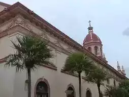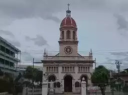 📸.. Santa Cruz Church is an orange-pink building distinguished by its Renaissance architecture, featuring a tall dome with a wooden cross on top, arched doorways, curved columns and beams supporting the structure, and stained glass windows.