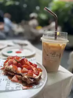 The atmosphere inside the shop is shady, with plenty of green space, along with art or artistic mess 😂 Many creative activities like drawing, painting dolls, or splattering paint in art—it's up to us to create our own masterpieces. There are also delicious food, drinks, and desserts.