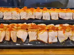Sushi prices start at 10-45 baht per piece, depending on the topping you choose. There are also other menu items such as soy-marinated salmon head, salmon salad, marinated salmon, Korean marinated shrimp, and garlic fried rice.