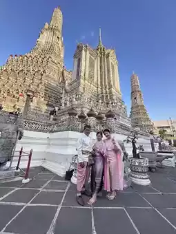 🛕 The atmosphere at Wat Arun is stunning, especially during the soft sunlight when the light hits the patterns on the prang. Wearing traditional Thai outfits made every photo come out beautiful from every angle.